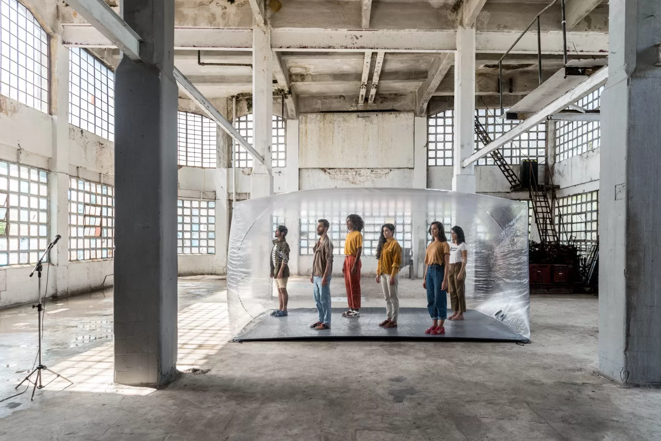 Una apariencia vital, cuya estructura inflable plantea nuevas experiencias del espacio, el cuerpo, la convivencia y sus límites en una puesta multidisciplinar. Contenidos en un mismo ámbito metafórico propone adentrarse en ese mundo lúdico, despertando en el espectador nuevos imaginarios simbólicos. Una masa de cuerpos dentro de un espacio, resultado de la sumatoria de individualidades, muestra la interacción, mutación y diálogo, conceptos que aparecen en el “yo colectivo” de “Dentro”.