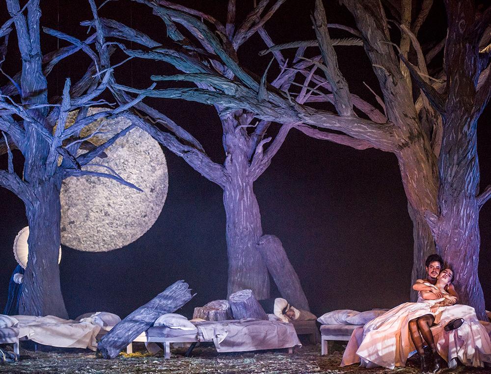 Vivi Tellas tiene una mirada propia de las obras que hace y esta no es la excepción, la puesta mezcla una porción de minimalismo escenográfico -de la mano de Guillermo Kuitca-, que se rompe con un gran bosque que se eleva desde el tercer subsuelo al empezar el segundo acto, con la cuasi constante presencia de los actores en escena como si fueran testigos silenciosos de los hechos.